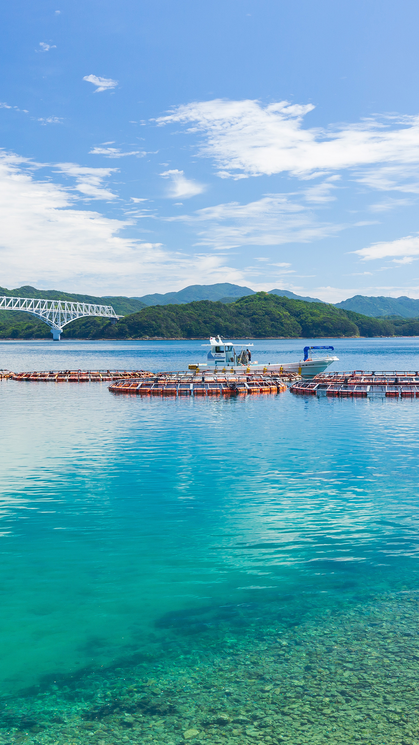 長崎市より西に100km。豊かな自然が広がる五島列島・若松島に徳丸の養殖場はあります。